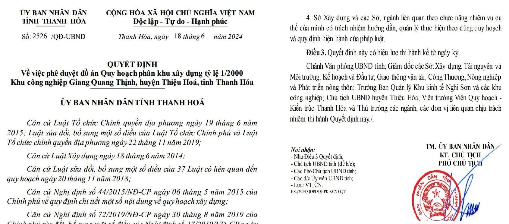 Phó Chủ tịch UBND tỉnh Thanh Hoá Mai Xuân Liêm vừa ký ban hành Quyết định số 2526/QĐ-UBND về việc phê duyệt đồ án quy hoạch phân khu xây dựng tỷ lệ 1/2000 Khu công nghiệp Giang Quang Thịnh, huyện Thiệu Hóa.